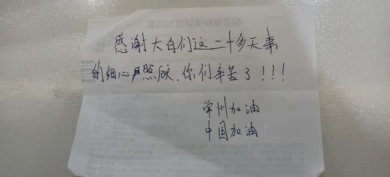 3月20日,医疗队正式接手西太湖医院的工作。工作并没有想象中的顺利,医疗队面临改造病区、物资暂缺、感控等等问题,在大家的共同努力下,所有的难题都迎刃而解,工作流程也越来越熟练。好多患者比较焦虑,疑问较多,我们也总会在查房时耐心的告知,结合自身专业知识,尽可能科学详尽的给患者解释清楚,做好心理疏导。一批又一批的新冠患者陆续康复出院,在口头感谢之余,他们也时不时会在小纸条上留下对我们的肯定与感谢。