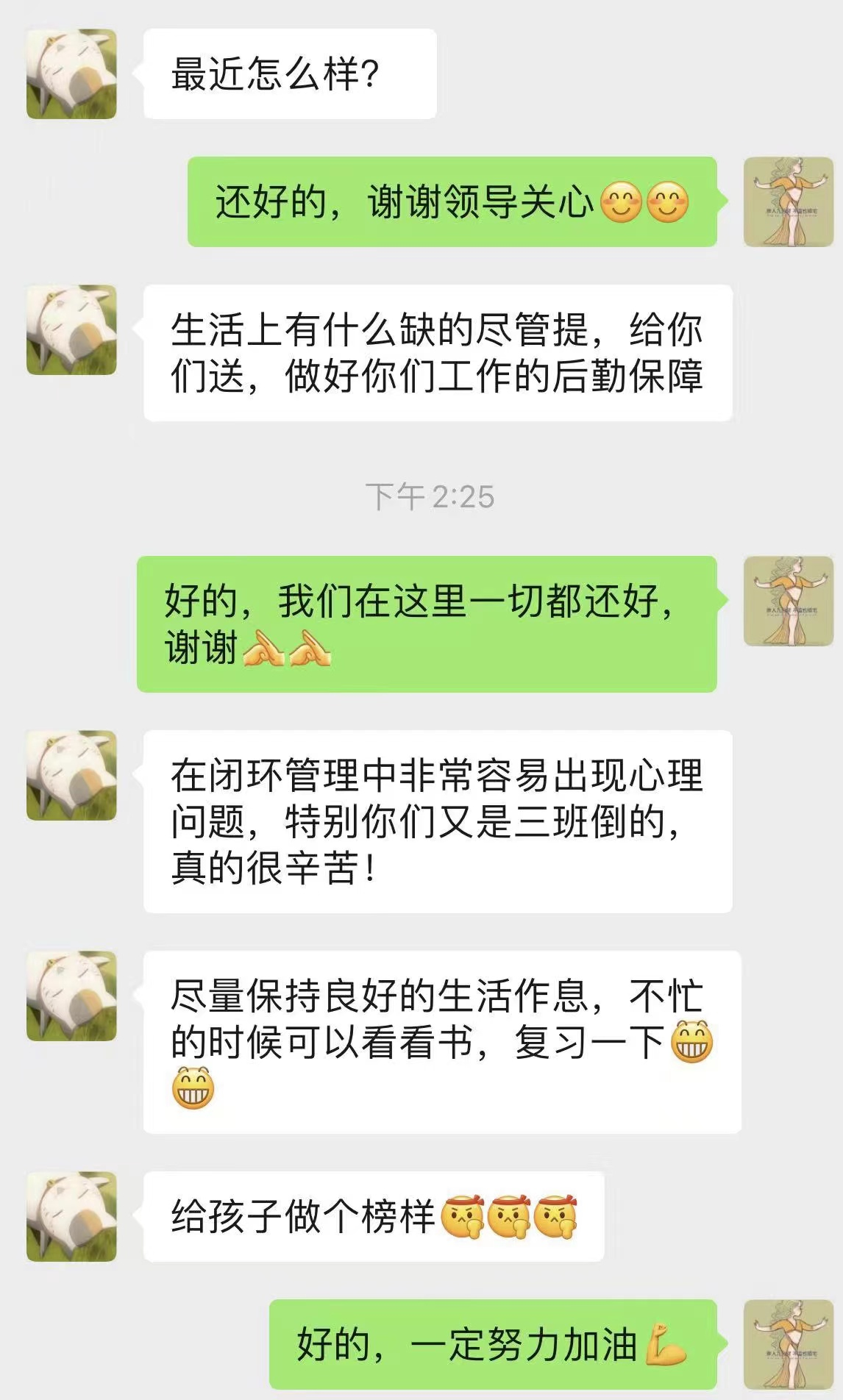 这段时间收到领导们的问候信息,关心我们的生活、工作情况,伙食怎样,休息好不好,物资保障到位没,提醒我们做好防护,注意休息。所有的关心和爱护,像春天的和风吹拂,抚慰我们有些疲惫的身心。大家上岗时都像打了鸡血一般,心中只有一个信念:我们要努力工作,与病毒赛跑,打赢这一场硬战!