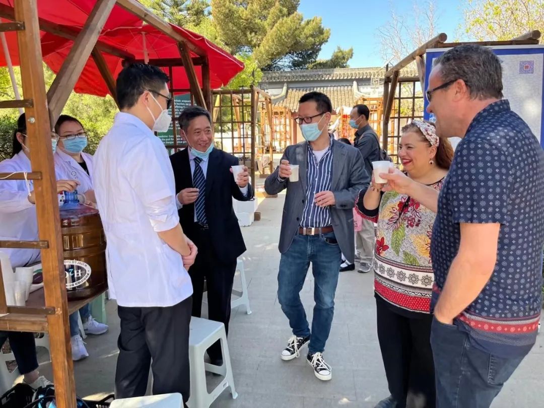 除此之外,医疗队还精心准备了用枸杞、红枣、姜片、菊花等中药材泡制的特色中药茶饮,让游园疲惫口渴的马耳他民众免费品尝,中药茶饮生津止渴,除乏解疲受到大家的热烈追捧。