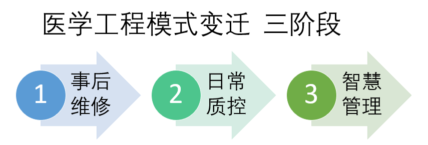 第三阶段是“智慧管理”, 在技术发展日新月异的今天,医院规模扩大后专业设备被大量使用,医学工程部的职能更偏重于设备管理。设备的增多,专业工程师的减少,造成人均医疗设备数量激增,对于专业医学工程管理人员也提出新的挑战,“智转数改”正是响应国策,以及智慧医疗这一大势所趋的重要手段。